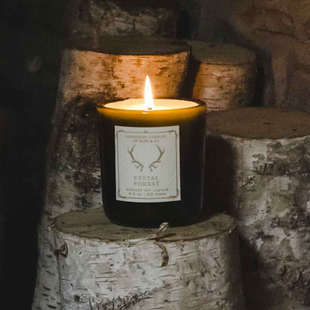 Lodestone Festal Forest candle with sweet berries and balsam woods.